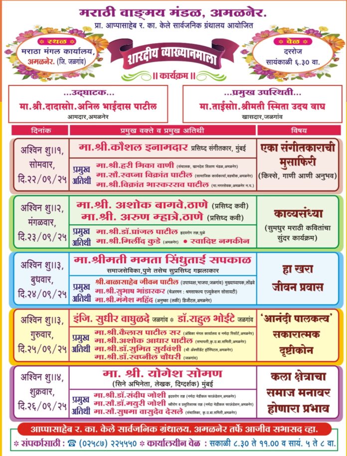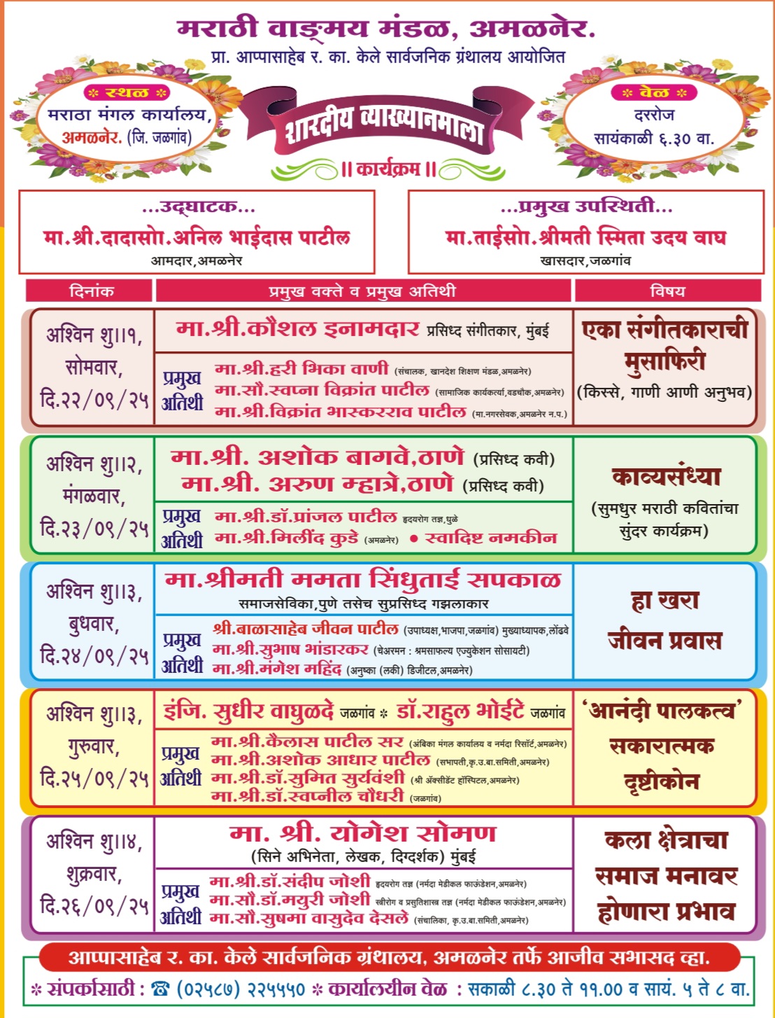 अमळनेर :- मराठी वाङ्‌मय मंडळ, अमळनेर व प्रा. आप्पासाहेब र. का. केले सार्वजनिक ग्रंथालय व मोफत वाचनालय, अमळनेर यांच्या संयुक्त विद्यमाने दि. 22 ते 26 सप्टेंबर 2025 दरम्यान शारदीय व्याख्यानमालेचे आयोजन करण्यात आले आहे. व्याख्यानमालेचे उद्घाटन मा. अनिल भाईदास पाटील (आमदार) यांच्या हस्ते होणार असून, मा. स्मिता उदय वाघ (खासदार, जळगाव) यांची प्रमुख उपस्थिती लाभणार आहे.