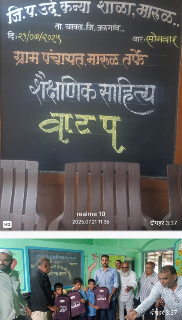 मारूळ गावात आज ग्रामपंचायतीच्या वतीने जिल्हा परिषद शाळांना मोफत स्कूल बॅगचे वाटप करण्यात आले. सुमारे 1 हजार मुलांना मोफत दप्तर देण्यात आले. यावेळी ग्रामपंचायत मारुलचे सरपंच सय्यद असद जावेद अहमद, उपसरपंच राफिया बेगम, मेहनाज बेगम ग्रामपंचायत सदस्य, रुखसार अंजुम, ग्रामपंचायत सदस्य फारुकी मुख्तारुद्दीन, मुर्तजा अली व गफ्फार तडवी सदस्य व शाळेचे शिक्षक उपस्थित होते.