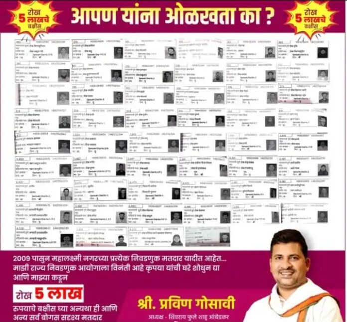 जर ही घरे शोधून दाखवली तर माझ्याकडून तब्बल पाच लाख रुपयांचे बक्षीस मिळवावे. अन्यथा बोगस सदृश्य नावे यादीतून काढावीत असे आवाहन गोसावी यांनी राज्य निवडणूक आयोगाला केले आहे. दरम्यान या बॅनरमुळे विभागातील नागरिक हा बॅनर पाहण्यासाठी गर्दी करत असून बॅनरवर असलेले मतदार आपल्या ओळखीचे आहेत का याची खातरजमा करत आहेत. मात्र सध्या चर्चेत असलेल्या मतदार यादीतील घोळबाबत शहरात जोरदार चर्चा सुरू झाली असून निवडणूक आयोग यावर काय भूमिका घेते हे पहावे लागेल.